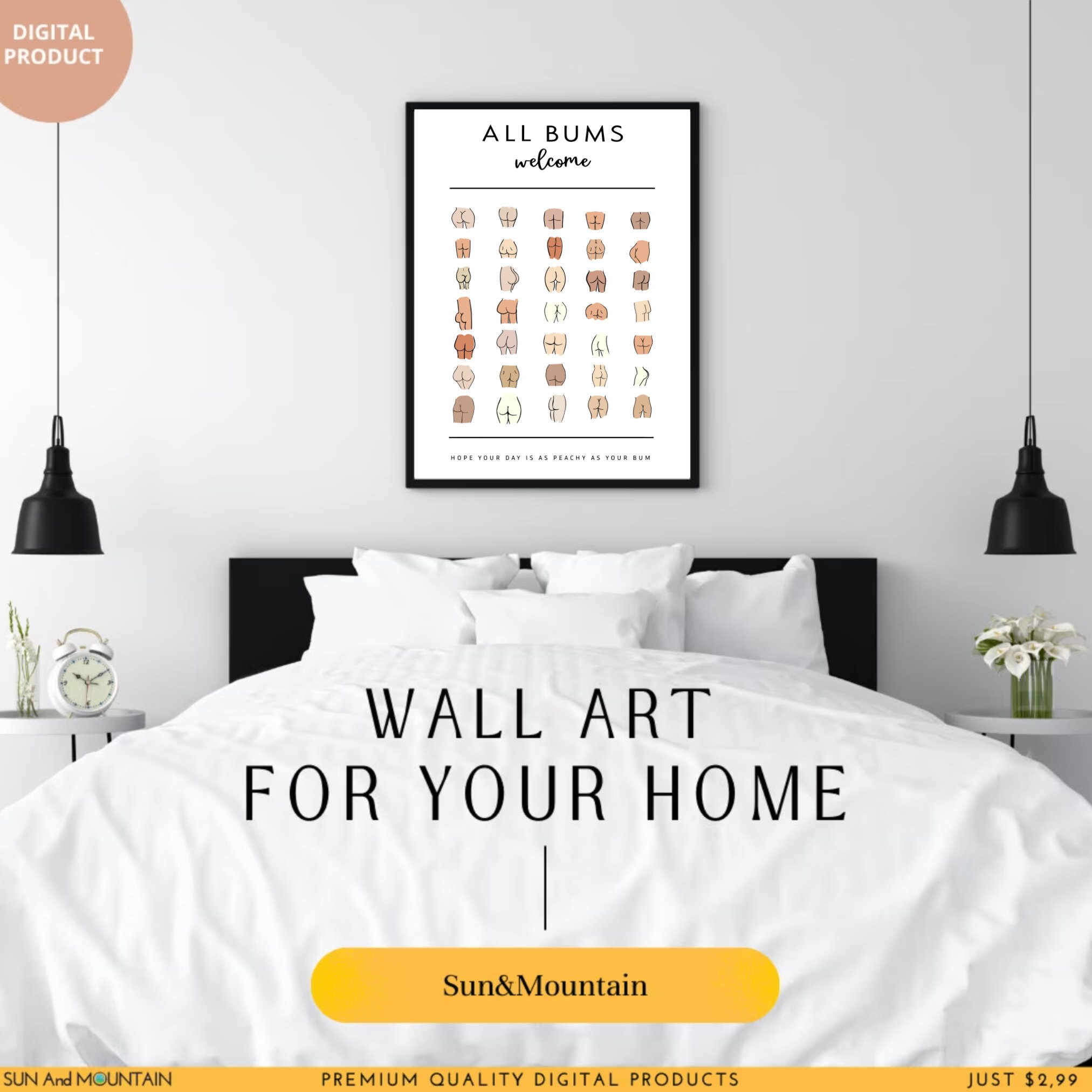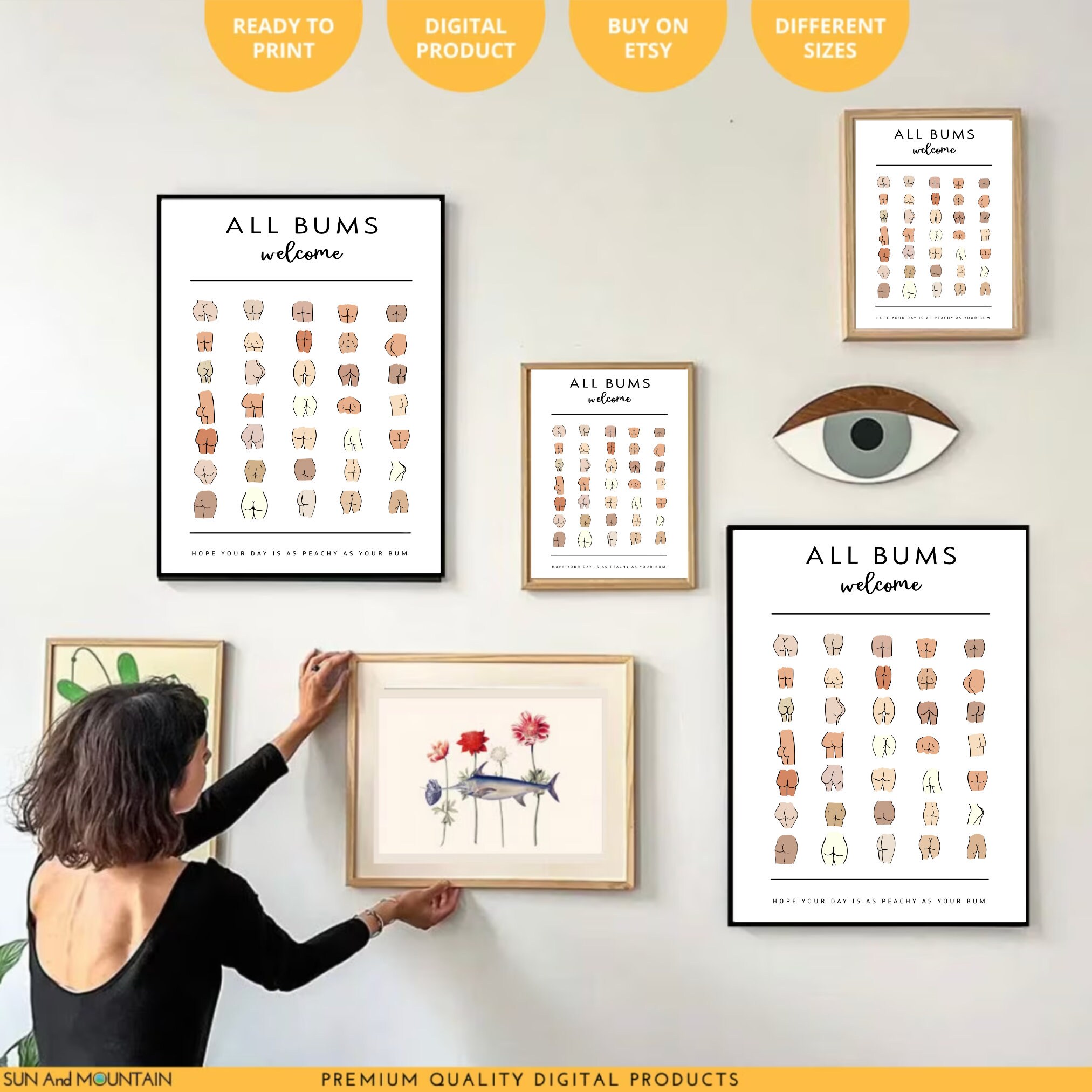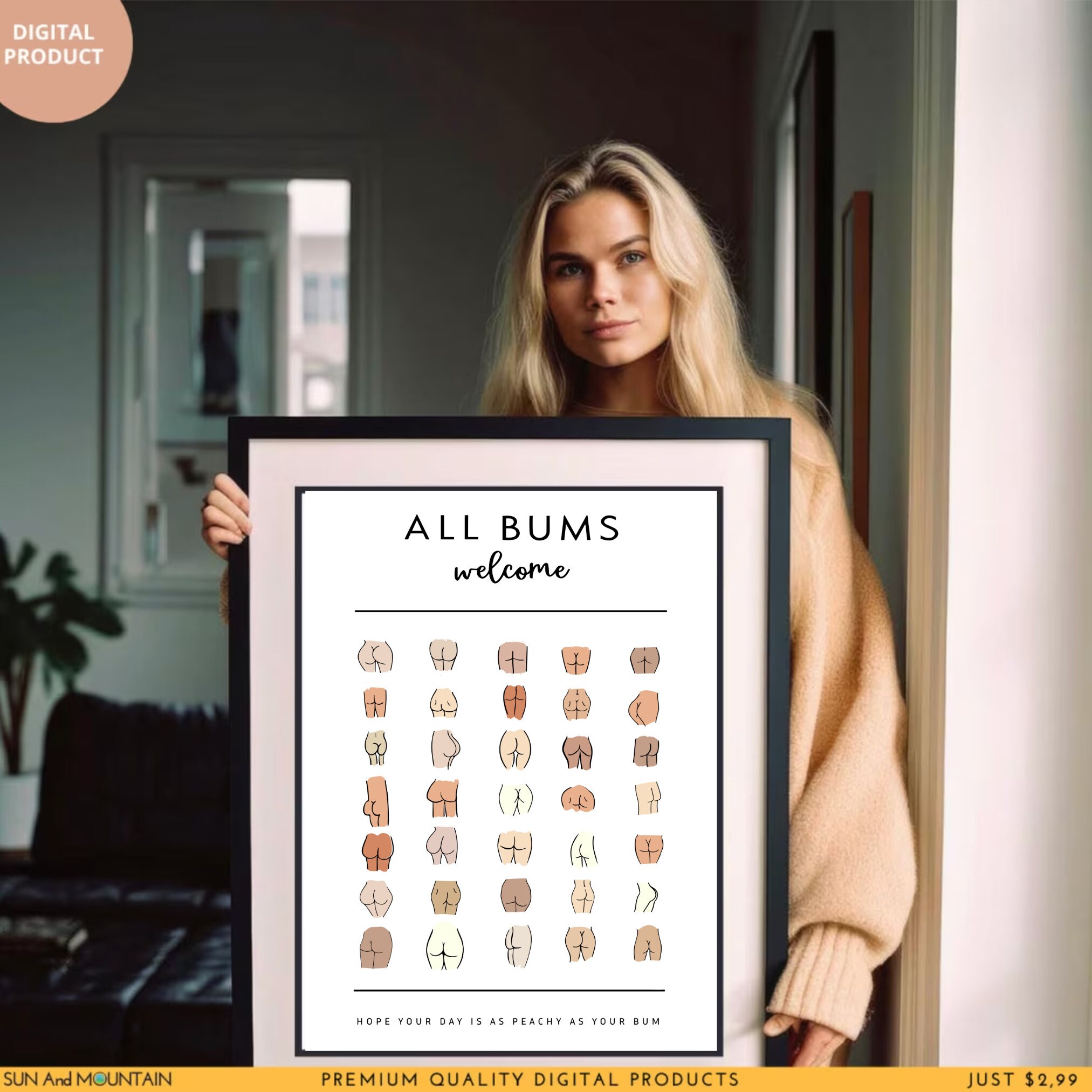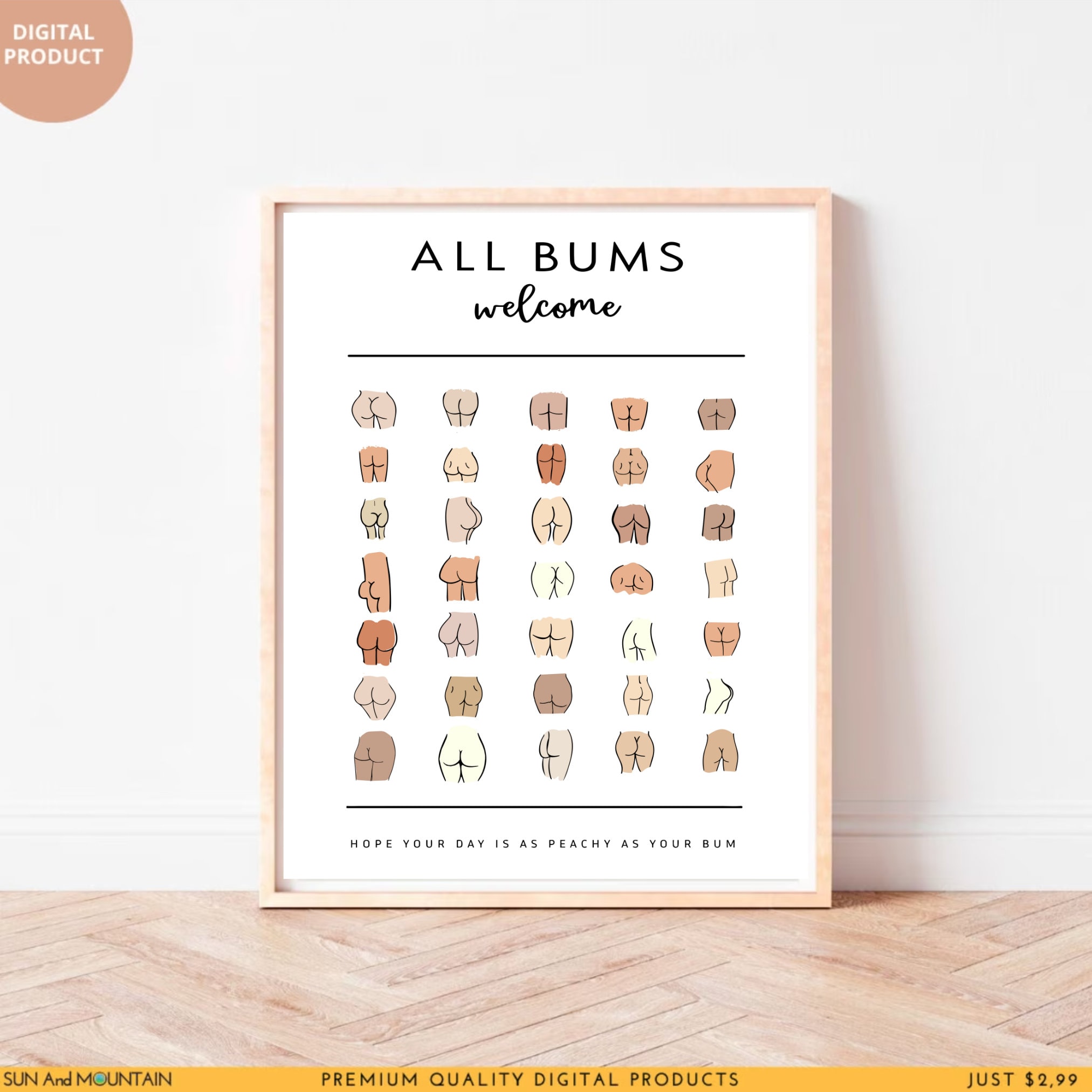 Funny Bathroom Art, All Bums Welcome, Cute Bathroom Butts, Bum Collage, Funny Bathroom Sign, Bathroom Wall Decor, Body Positive, Printable