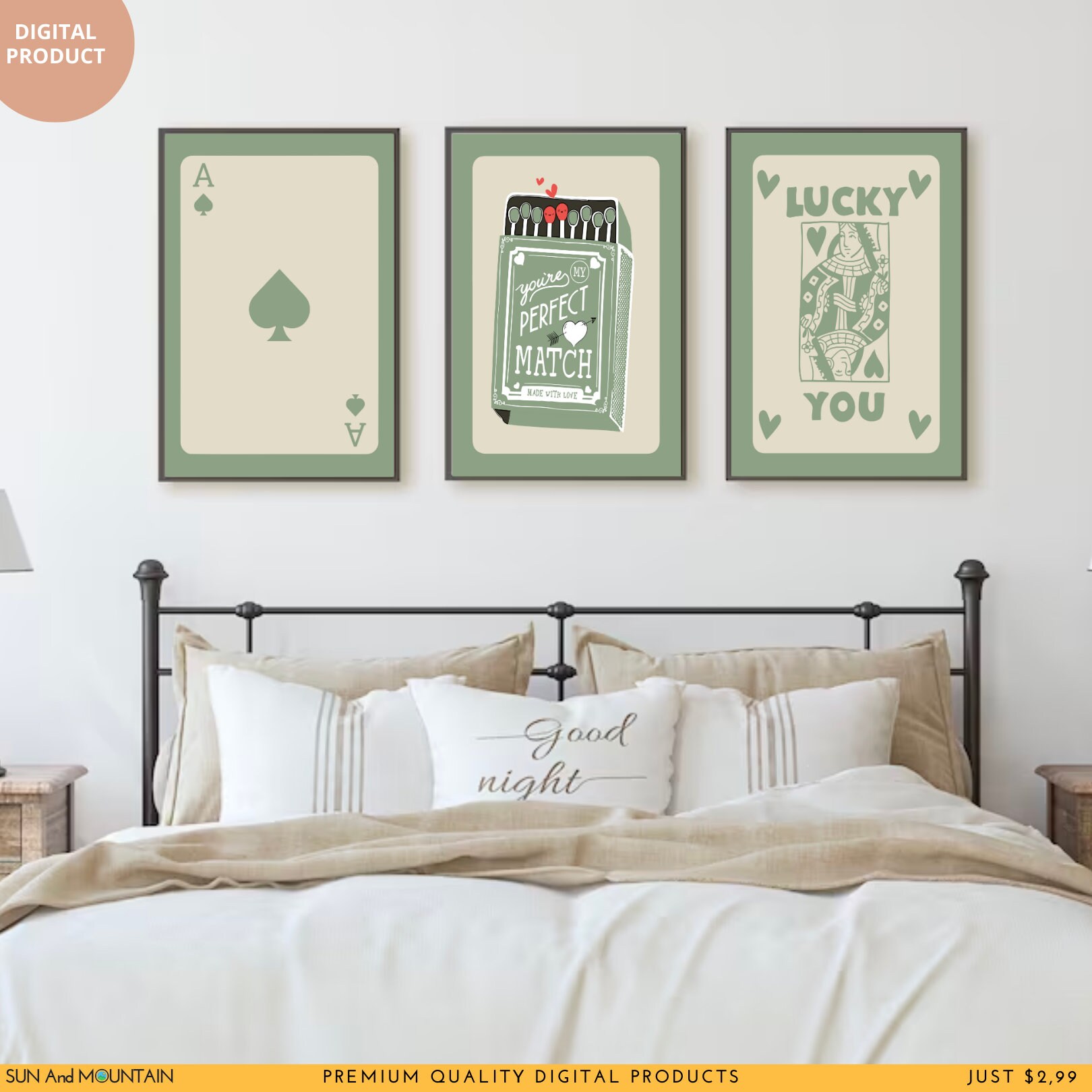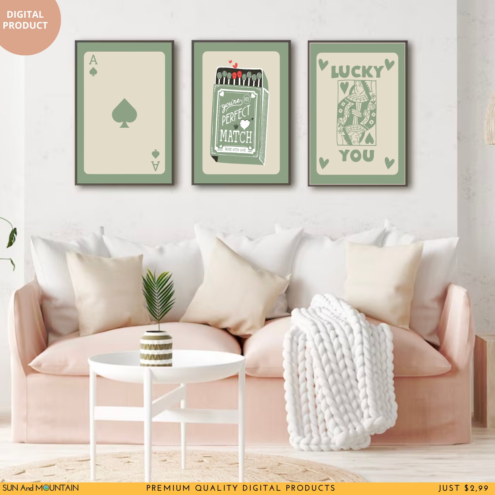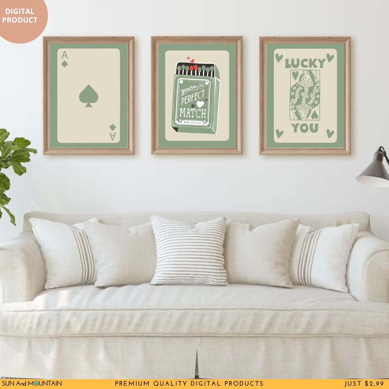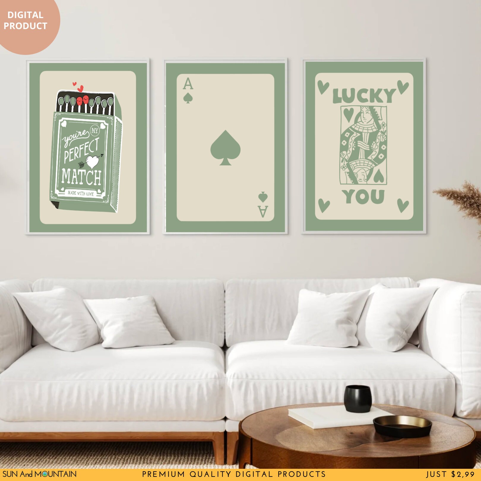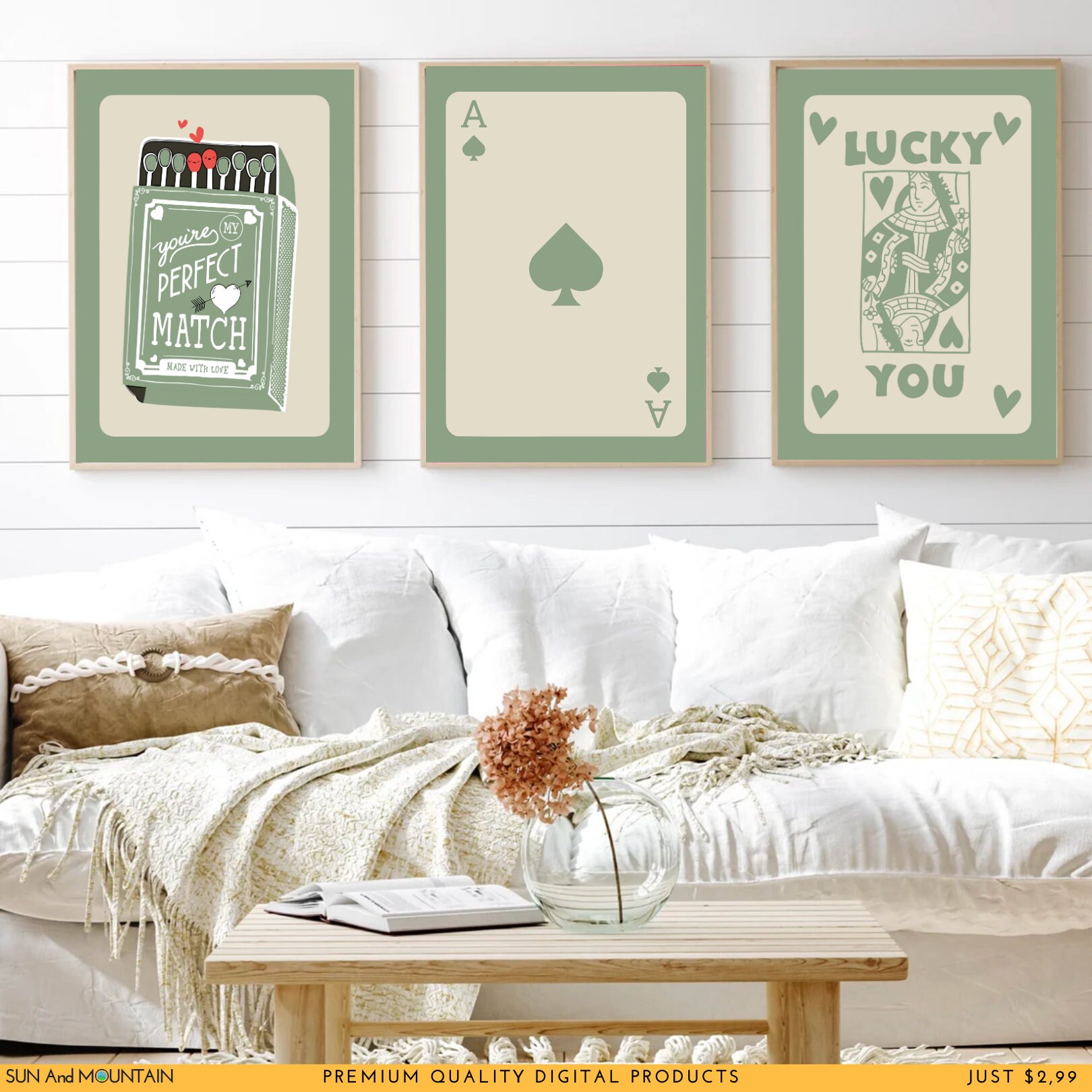 Retro Ace of Hearts Print Set: Green Trendy Wall Art (Digital Download)