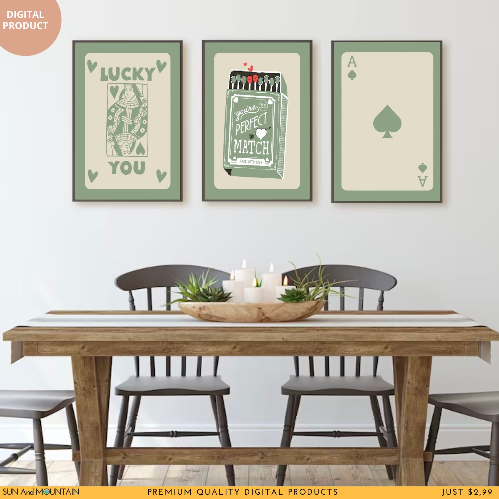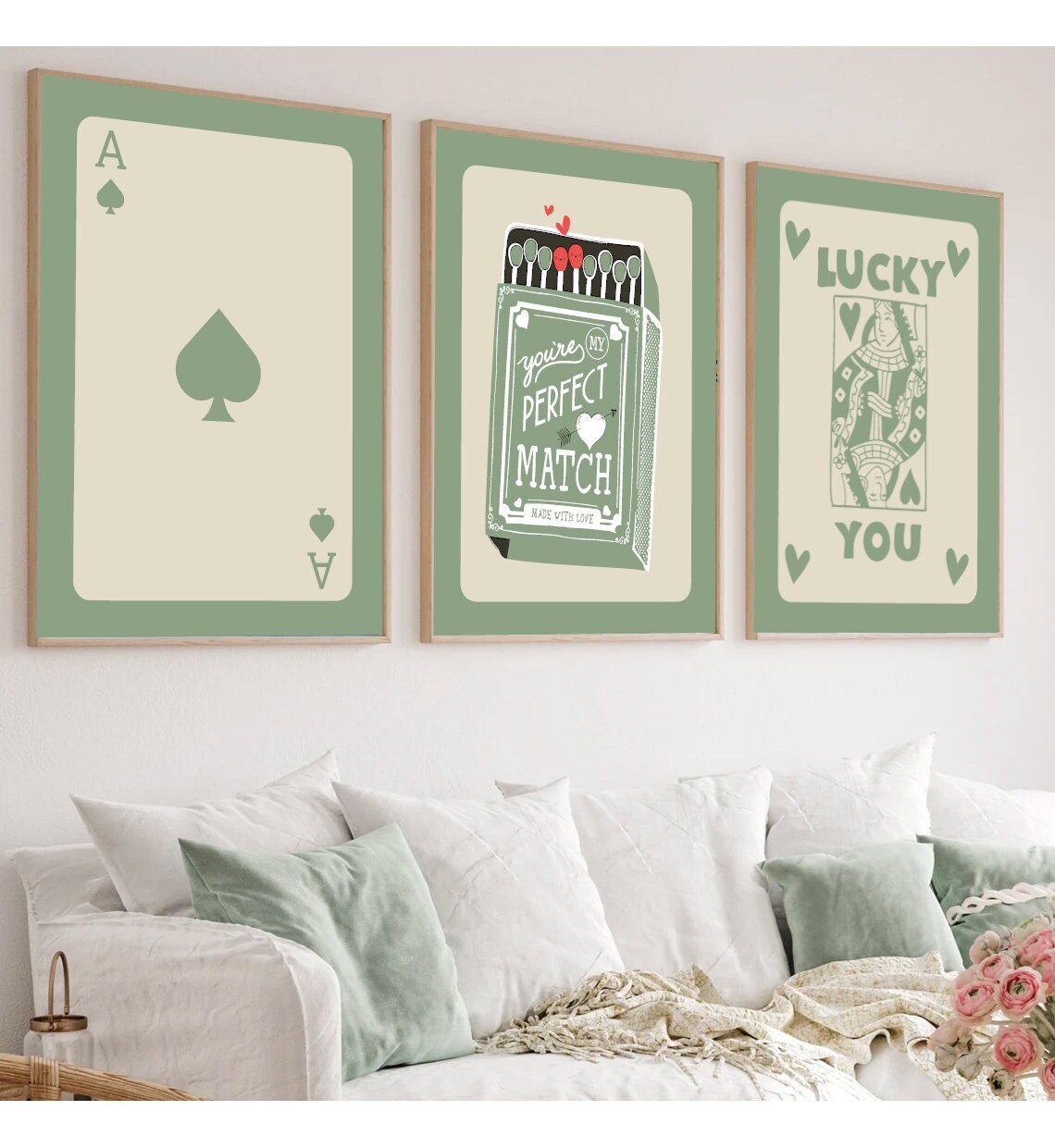 Trendy Ace Of Hearts Print | Lucky You Print Set Of 3 Green.