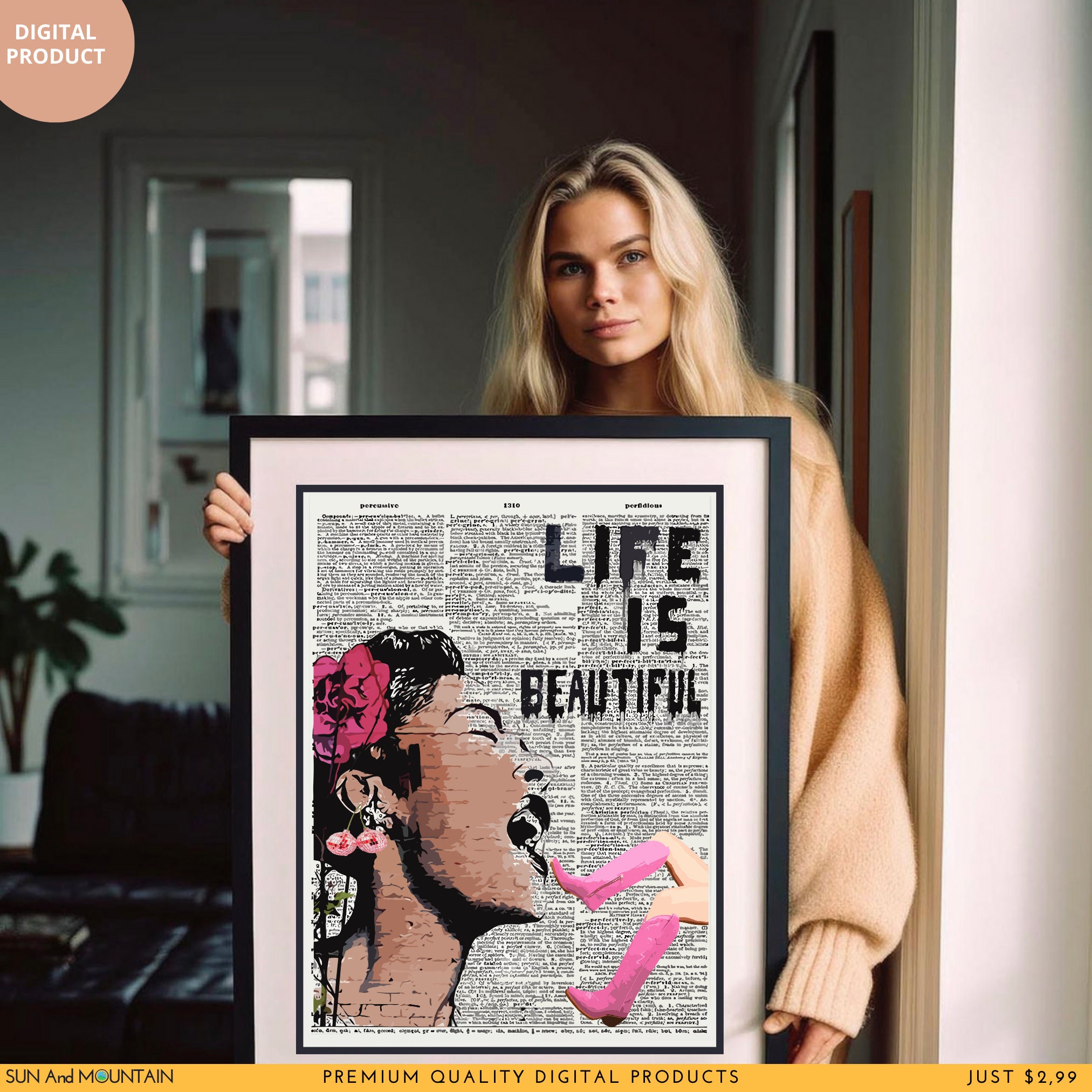 Retro Disco Cowgirl Collage Pink Print | Life is beautiful Banksy wall art.