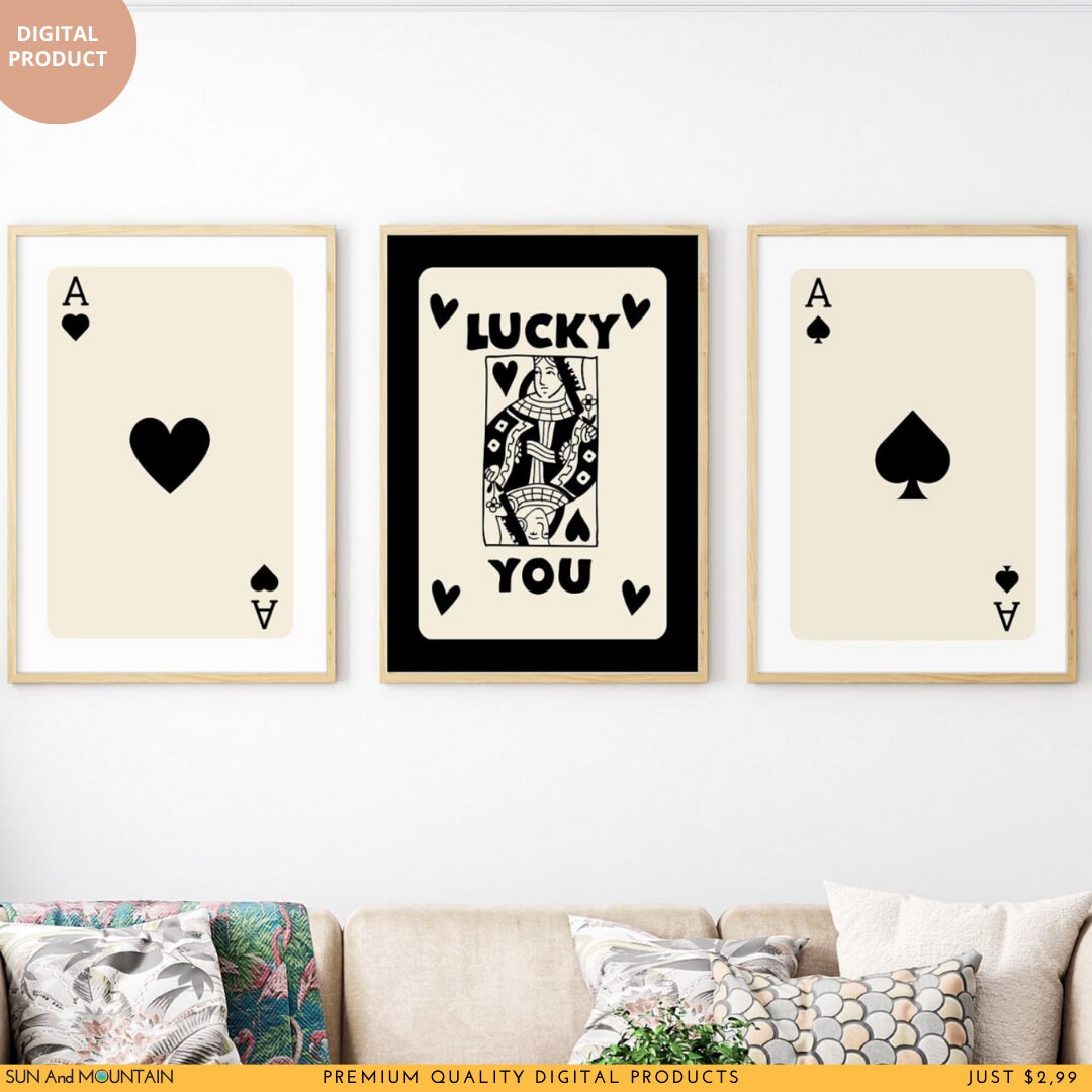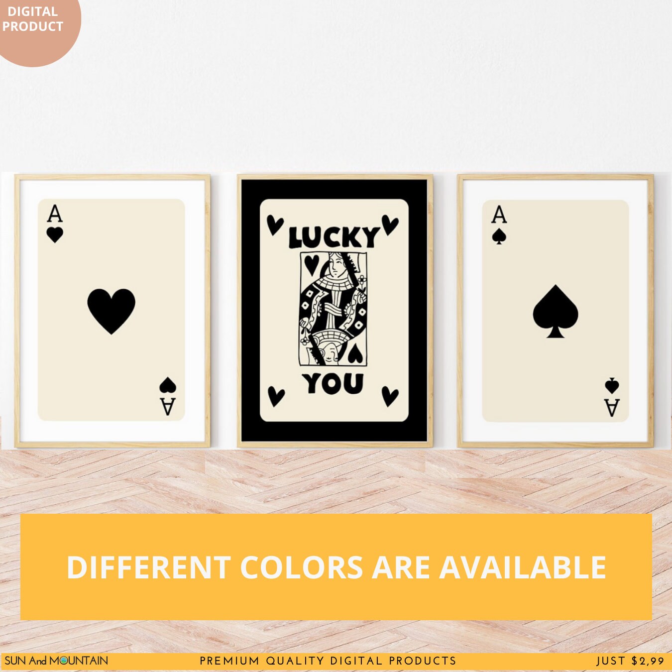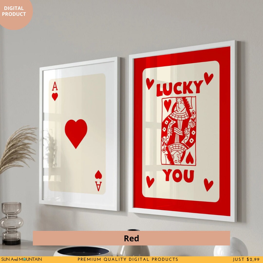 Add a touch of luck and modern art to your space with our 'Lucky You' 'Ace Card' ' Heart Card' 3 print set posters. This collection features stunning ace card prints in red, blue, pink, brown and black, perfect for creating a vibrant and stylish ambiance. Elevate your wall decor with our 'Lucky You' wall art, showcasing the timeless charm of ace playing cards. A must-have for card enthusiasts and those seeking a stroke of luck in their lives. Bring home this captivating ace card poster set today!