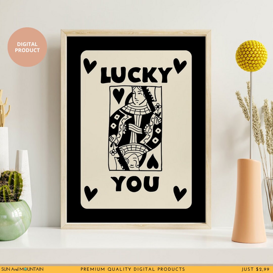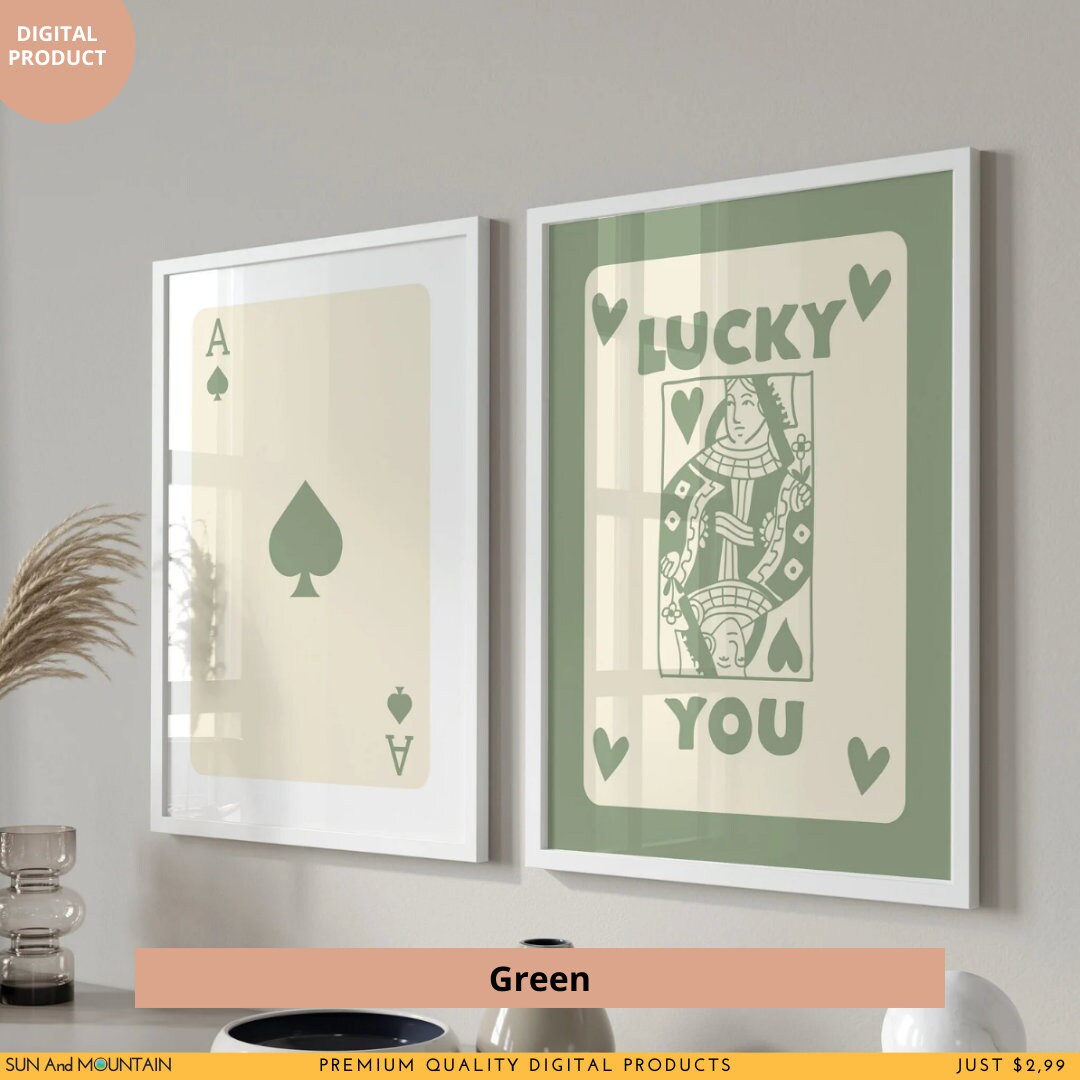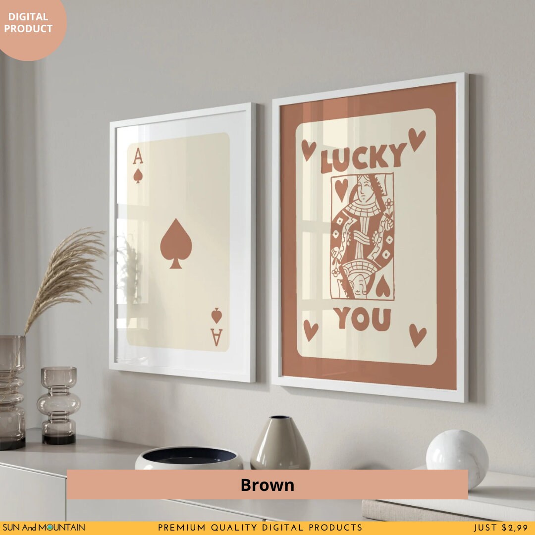Add a touch of luck and modern art to your space with our 'Lucky You' 'Ace Card' ' Heart Card' 3 print set posters. This collection features stunning ace card prints in red, blue, pink, brown and black, perfect for creating a vibrant and stylish ambiance. Elevate your wall decor with our 'Lucky You' wall art, showcasing the timeless charm of ace playing cards. A must-have for card enthusiasts and those seeking a stroke of luck in their lives. Bring home this captivating ace card poster set today!