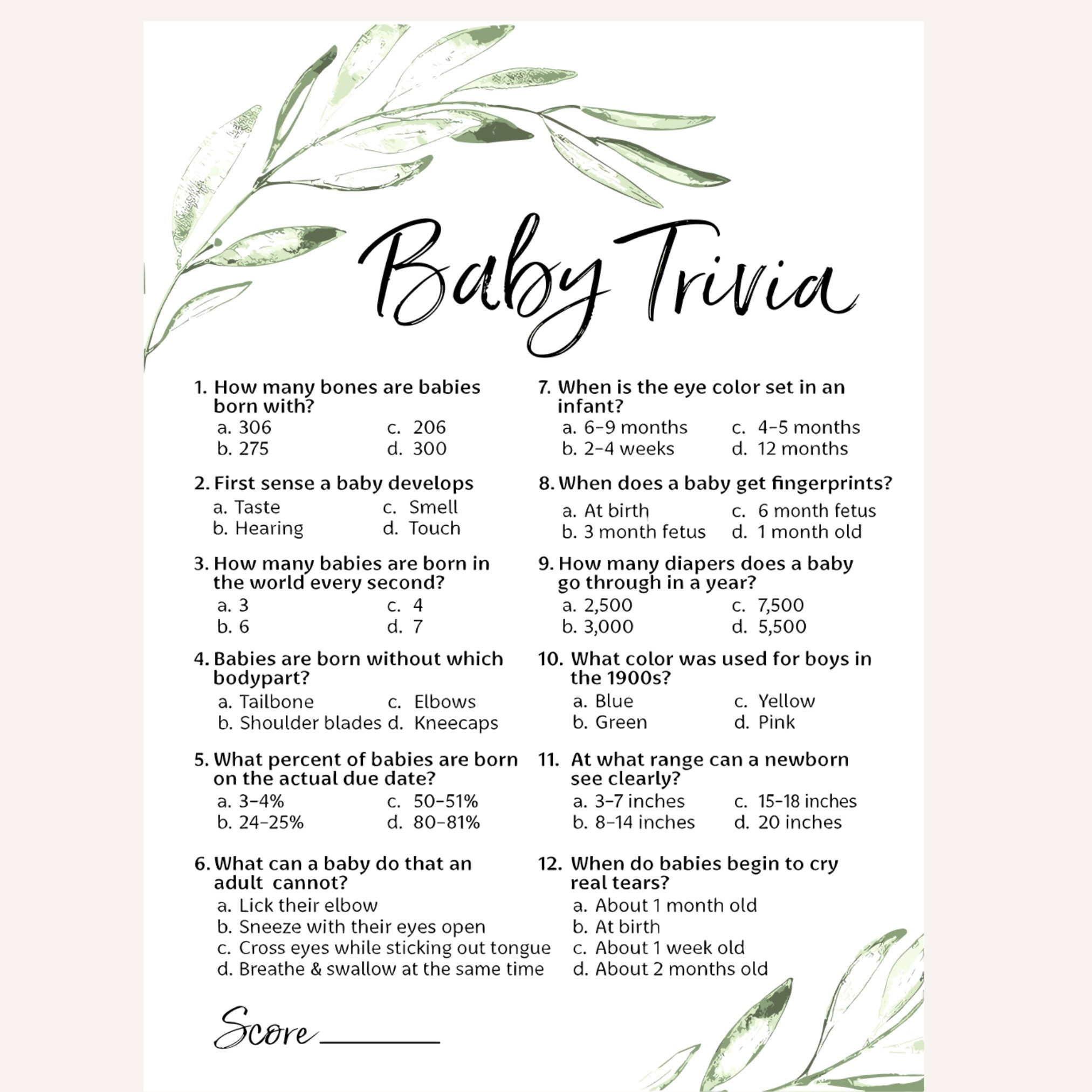 Are you looking for a fun and gender-neutral baby shower game? Look no further than our baby shower bundle! This package includes printable baby game cards, an activity sheet, and trivia questions. Plus, it's perfect for a minimalistic or greenery baby shower!