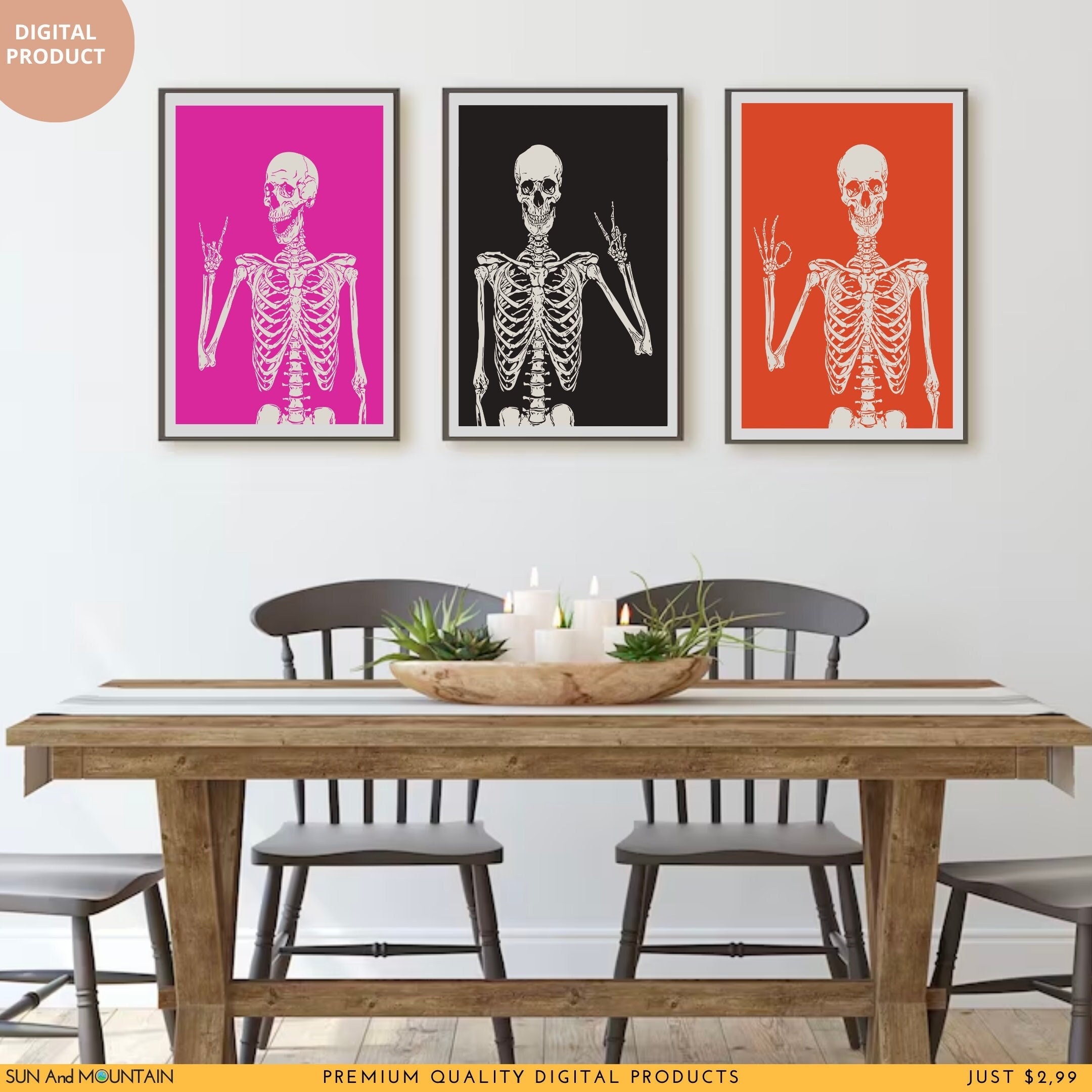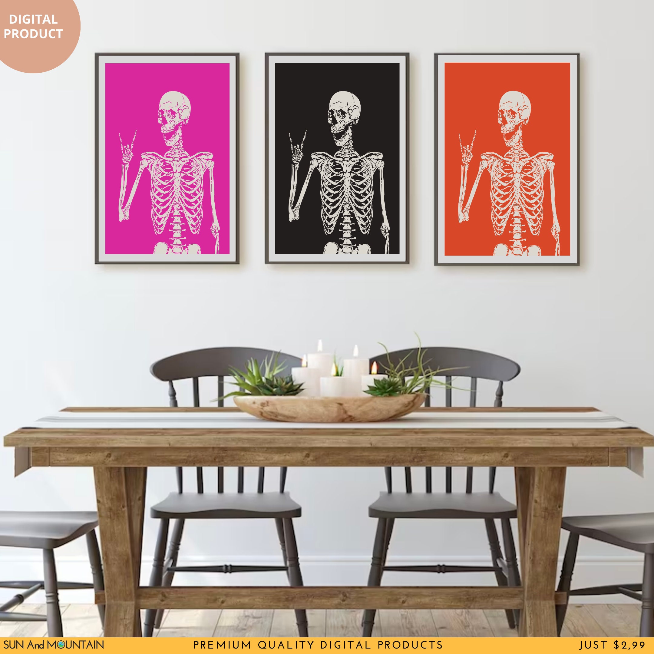 skeleton art,Skull print Set Of 3 Poster Pink, Orange and Black