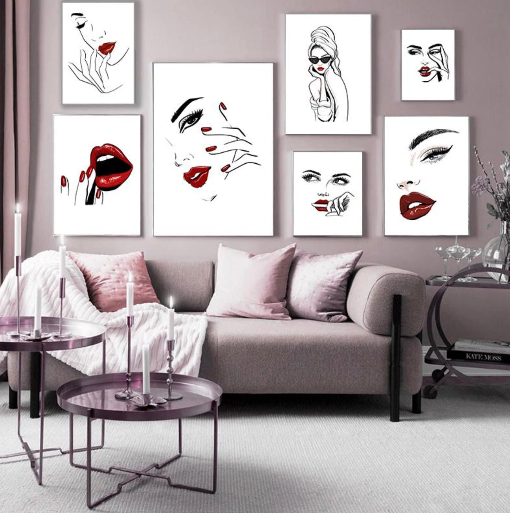 7 Chic Fashion Wall Art Prints, Minimalist Line Art, Female Figure, Red Lips, Nails, Trendy Decor